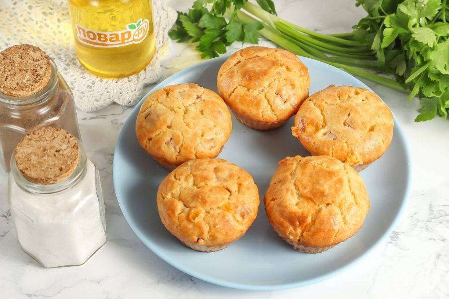 Украсьте капкейки кружочками помидоров черри, слайсами маринованных грибов или другим съедобным декором. Подайте их к столу.