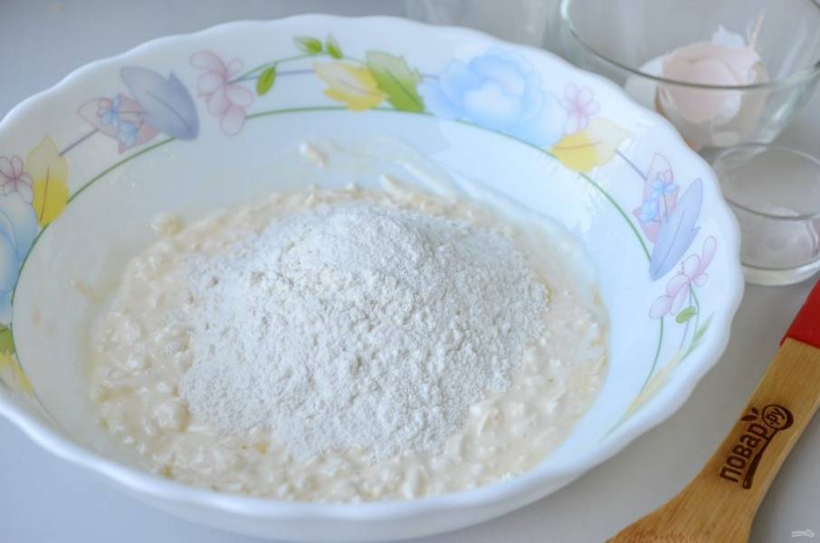 4. Введите просеянную муку, разрыхлитель, перемешайте ложкой тесто.