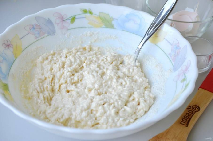 3. Добавьте к нему сырые яйца, сметану. Перемешайте.