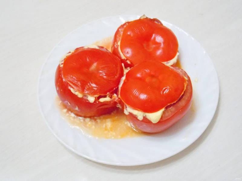 Поставьте в микроволновую печку и запекайте помидору в течение 3,5 - 4 минут при мощности 800 Вт. Сыр должен расправиться, а помидорки остаться целыми.