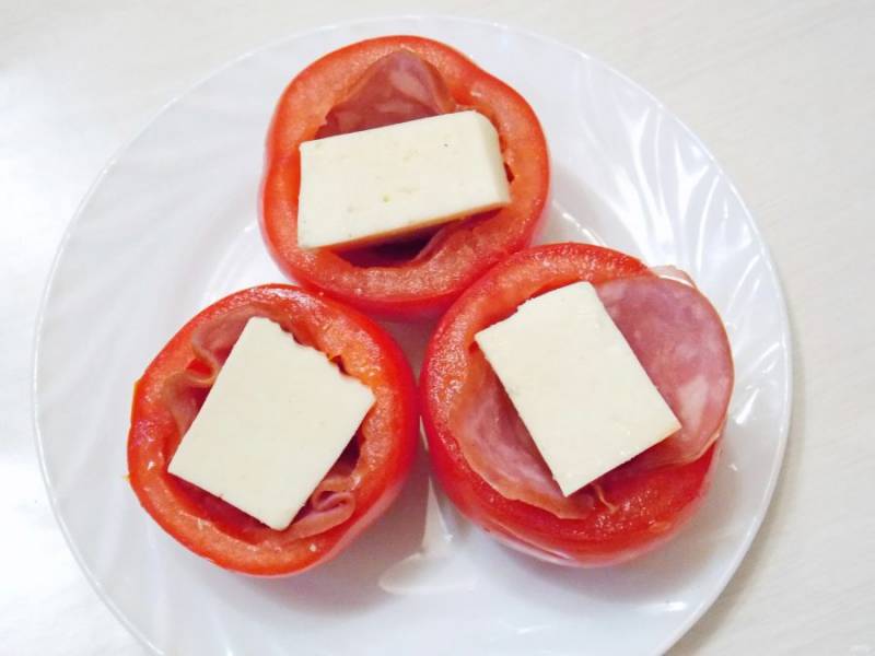 На верх помидор положите ломтики колбасы и вдавите ее вовнутрь кусочками сыра. Сыр должен получиться как бы в чашке из колбасы в помидоре.