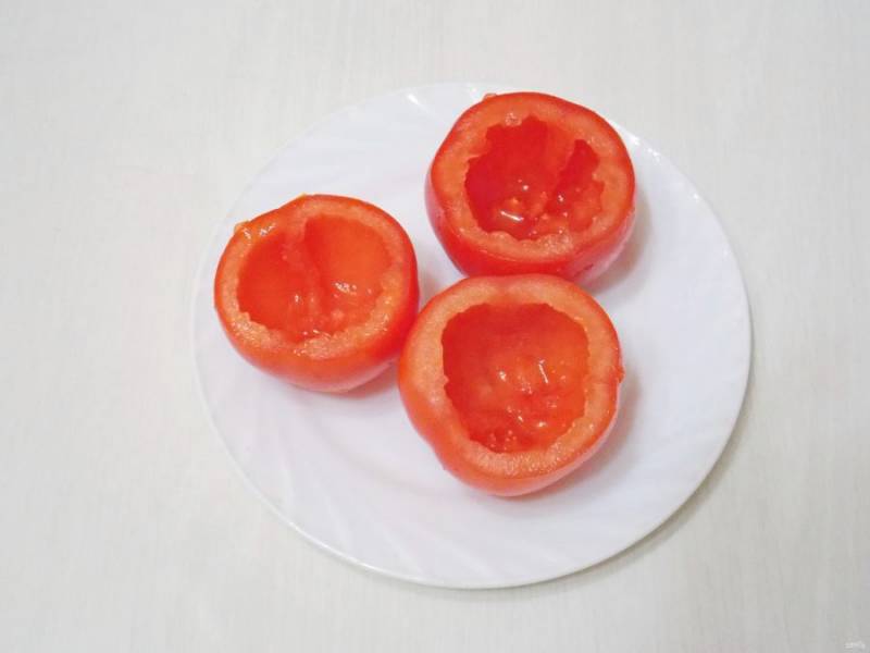 Помидорки вымойте и вытрите. Срежьте плодоножку и удалите середину (она не понадобится).