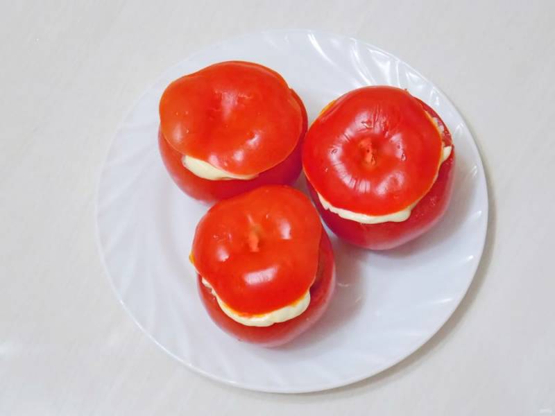 На верх положите по чайной ложке майонеза "Махеев" оливковый. Он придаст готовым помидоркам нужную нежность и пикантность.