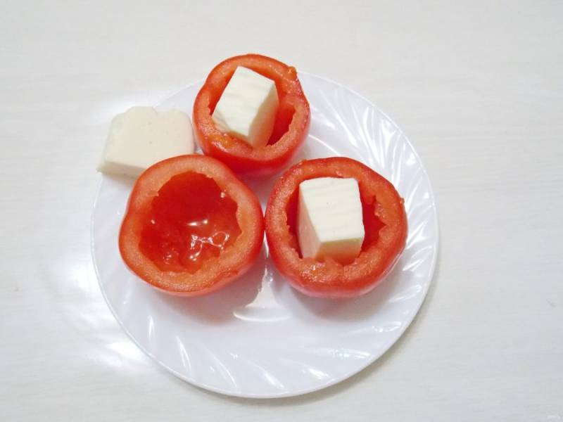Разрежьте сыр на 3 части, так, чтобы они свободно входили вовнутрь помидор.
