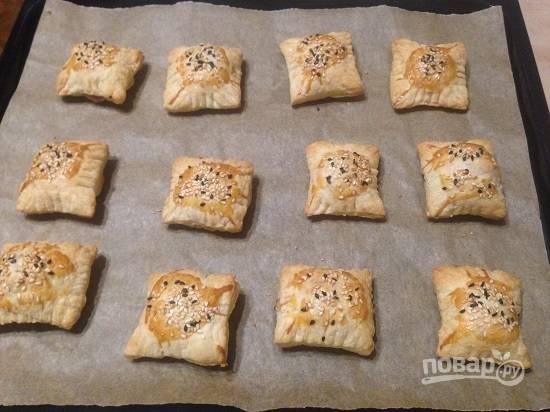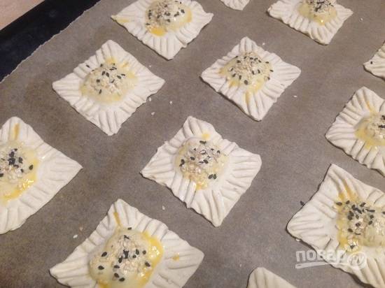 6. Перекладываем на противень, застеленный пергаментом, смазываем яйцом и посыпаем кунжутом.