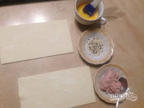 1. Тесто заранее размораживаем. Яйцо взбиваем и размешиваем.