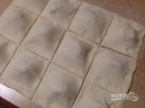 4. Накрываем вторым листом теста и острым ножом разрезаем на квадратики с горочками паштета посредине.