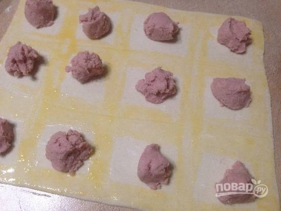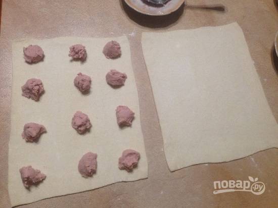 2. Слегка раскатаем листы теста и раскладываем на одном порции паштета. У меня получается 12 слоек.