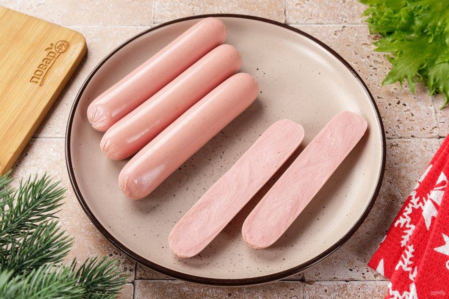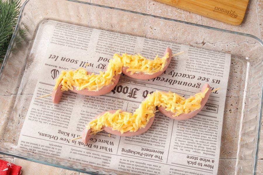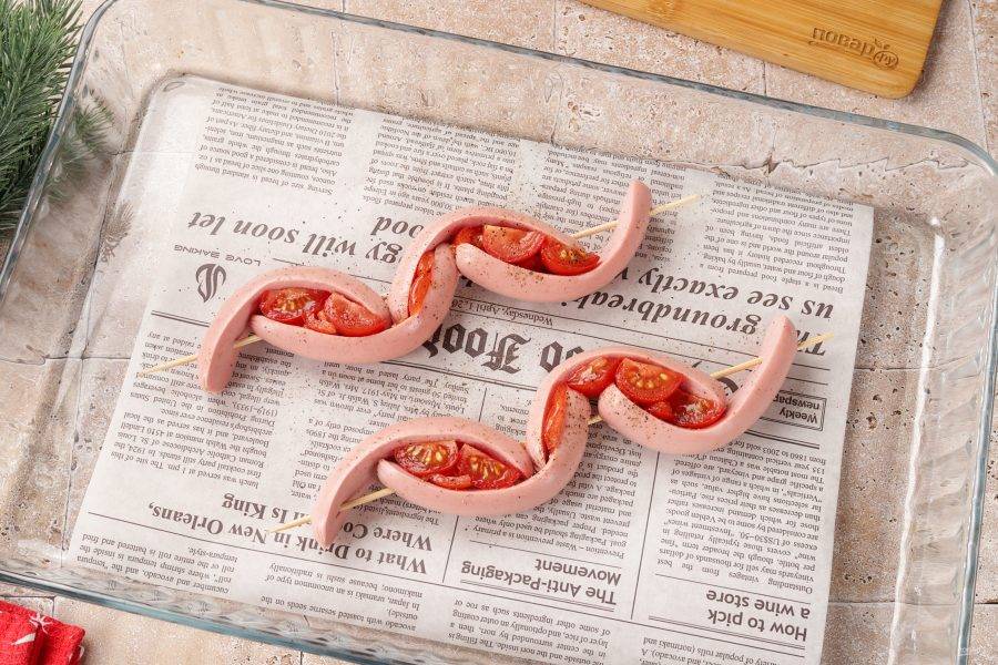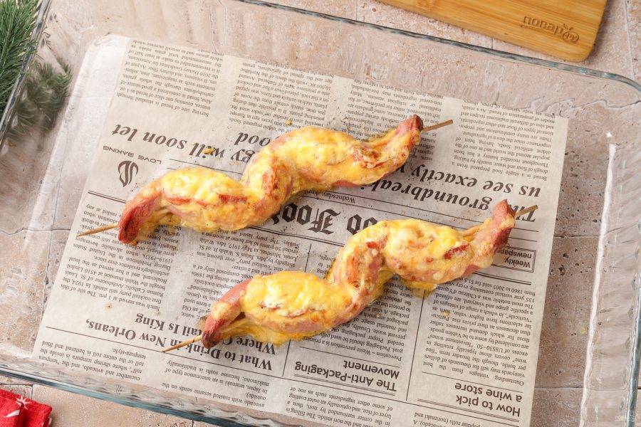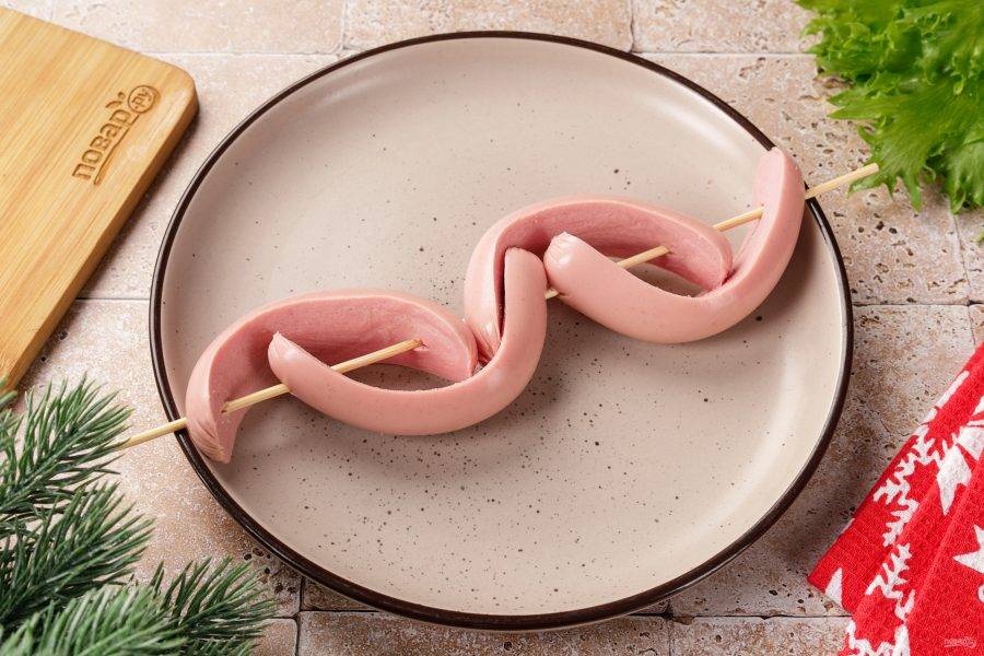 На шпажки поочерёдно нанизайте сосиски как на фото.