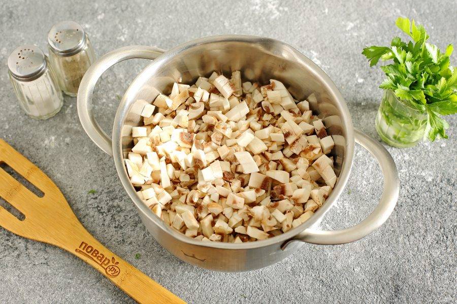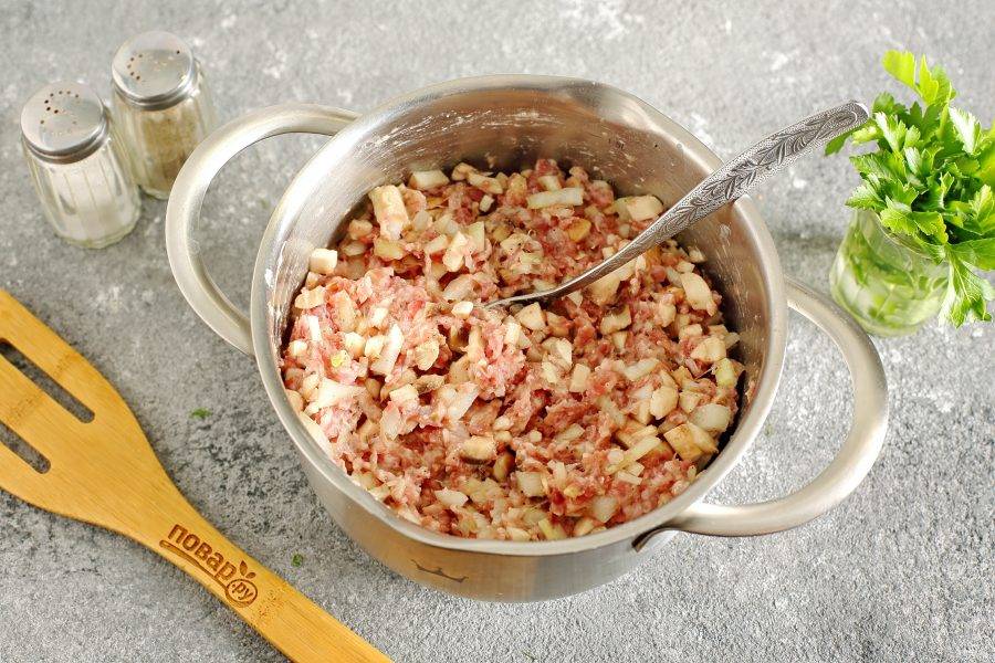 Добавьте к фаршу нарезанные кубиками грибы.