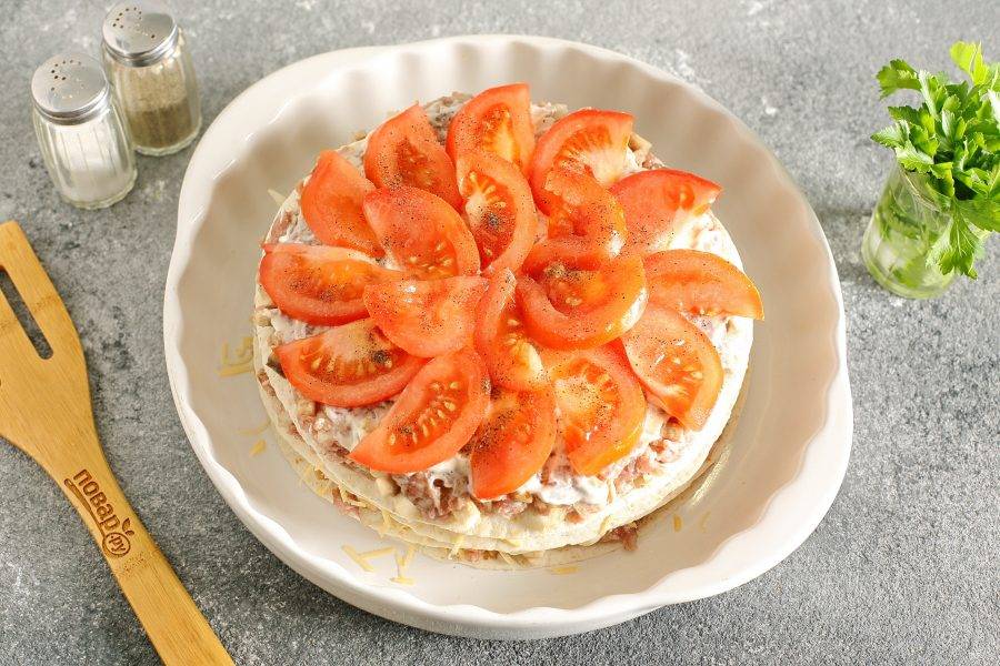 Соберите аналогично весь торт. Верх намажьте начинкой, смажьте майонезом и выложите нарезанные дольками помидоры.