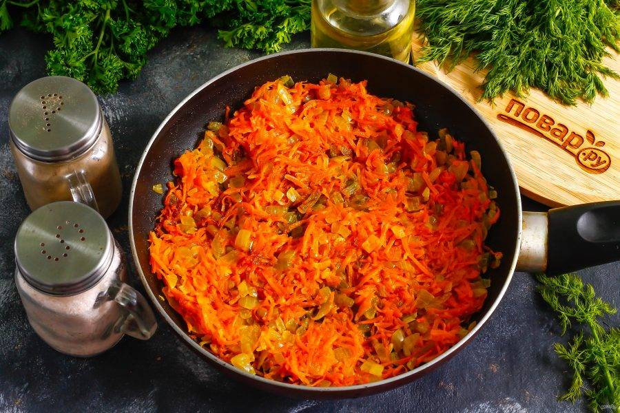 Отпассеруйте овощные нарезки примерно 4-5 минут до мягкости и легкой румяности. Выключите нагрев.