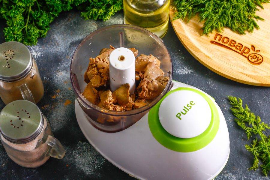 Печень измельчите в блендере, превращая массу в печеночное пюре.