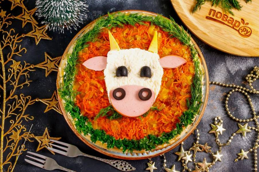 Красочный закусочный торт с символом будущего года прекрасно украсит новогодний стол. Вы можете сделать на нем мордочку быка и украсить его свежей зеленью. Берите на заметку рецепт!