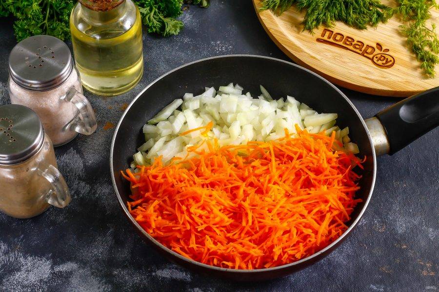 Очистите от кожуры и промойте репчатый лук и морковь. Натрите морковь на терке с мелкими ячейками, а лук нарежьте мелким кубиком. Влейте в сковороду 2 ст.л. растительного масла и выложите овощные нарезки.