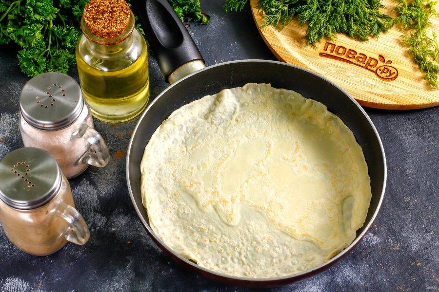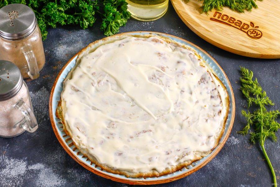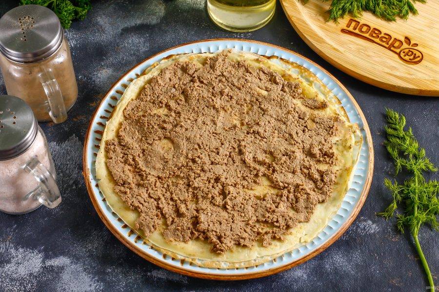 На тарелку выложите два блина в качестве основы, обмажьте их печеночным паштетом.