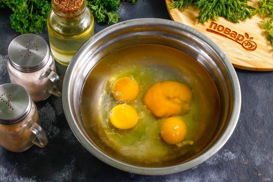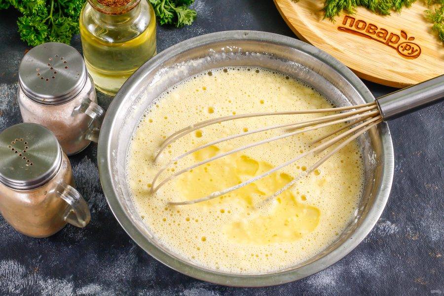 Куриные яйца вбейте в глубокую емкость. Туда же влейте воду и всыпьте 3-4 щепотки соли. Взбейте все венчиком примерно 3-4 минуты.