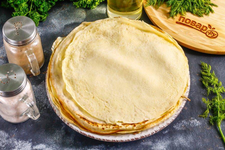 Затем накройте следующим блином и выложите на него часть обжаренных овощей. Накройте следующим блином и повторите печеночную начинку. И так далее, пока не закончатся блины или начинки.