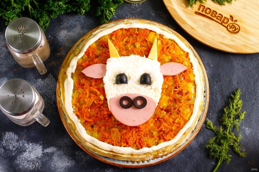 По контуру пирога выложите майонез и украсьте его свежей зеленью. Под мордочку быка вставьте немного зелени, как будто он ее жует. Поместите пирог в холодильник минимум на 1 час для пропитывания, а после — подайте к столу. Приятного аппетита!