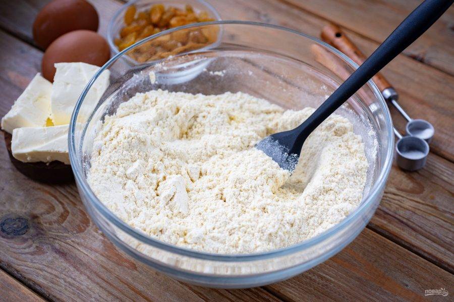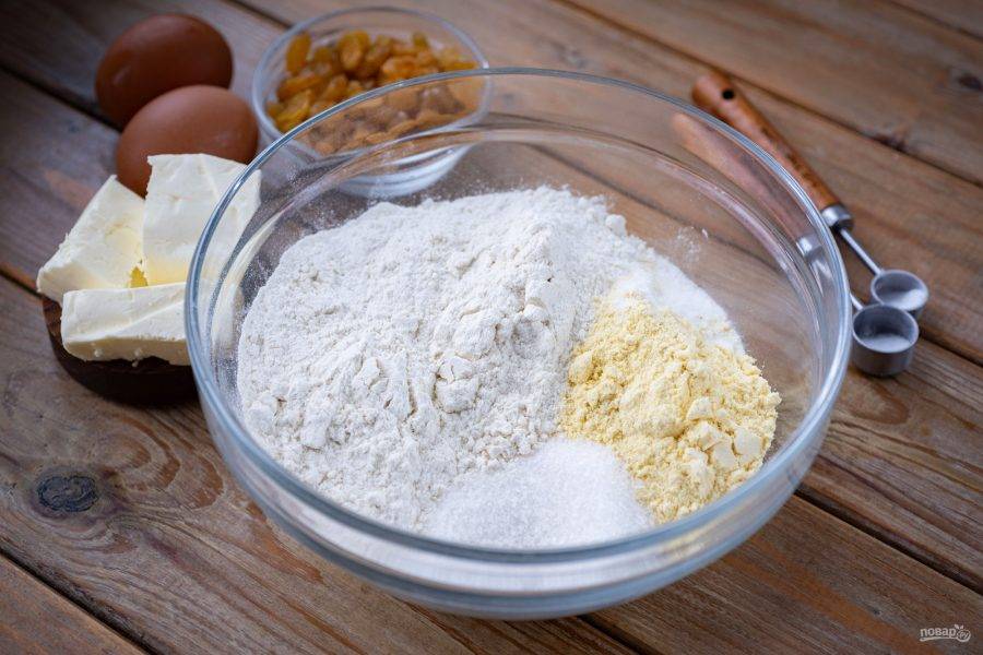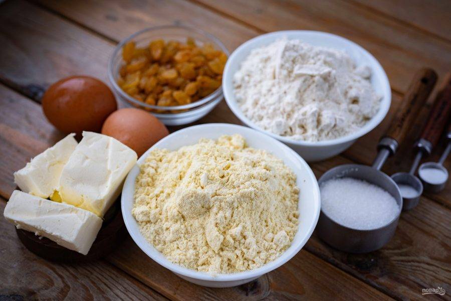 Все ингредиенты перед вами на столе. Удобно заранее промыть изюм и просушить на бумажных полотенцах. Также удобно заранее просеять муку.