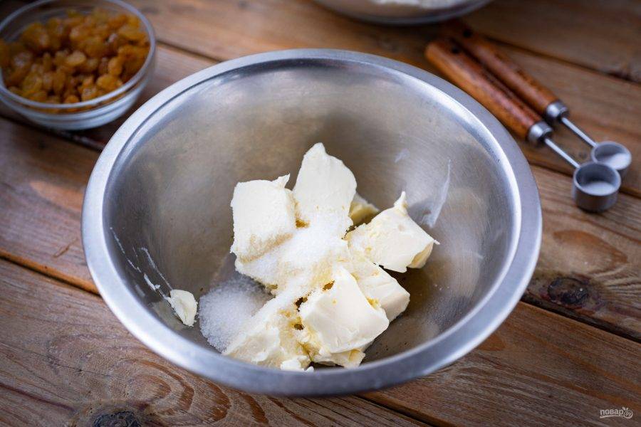 В удобную миску выложите мягкое масло и оставшийся сахар.