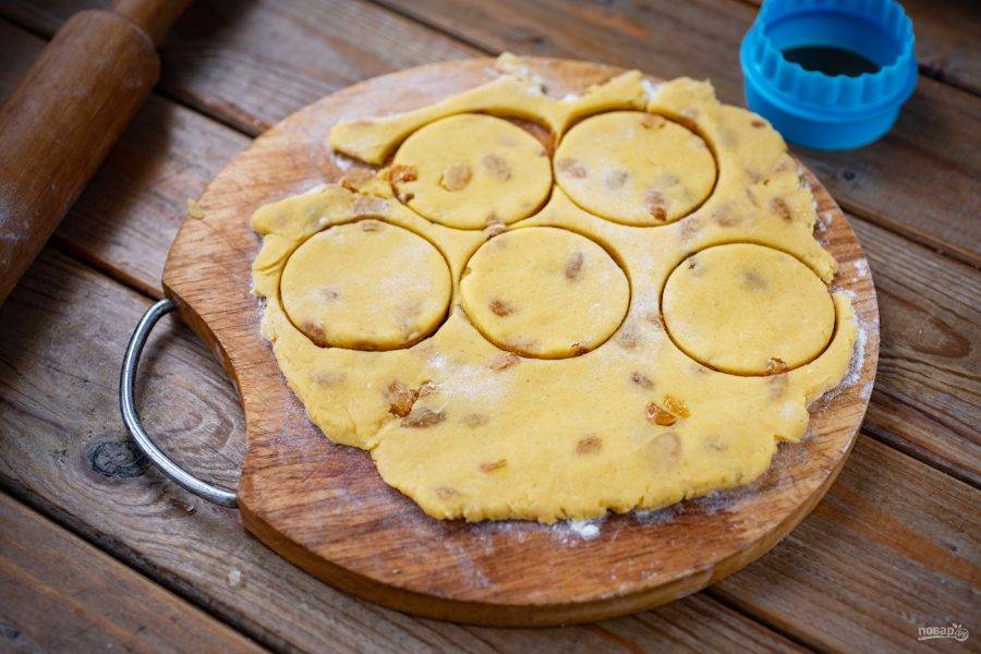 Рабочую поверхность припылите небольшим количеством пшеничной муки и раскатайте тесто в пласт толщиной в 0,4-0,5 см. Круглыми формочками вырежете заготовки печенья.