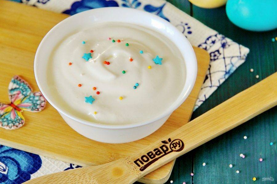 Снимите миску с водяной бани и взбейте белки еще раз. Заливка для куличей готова.