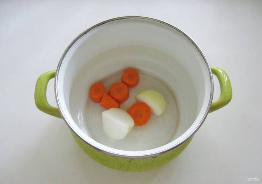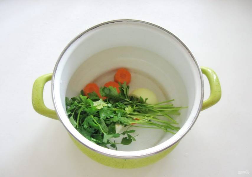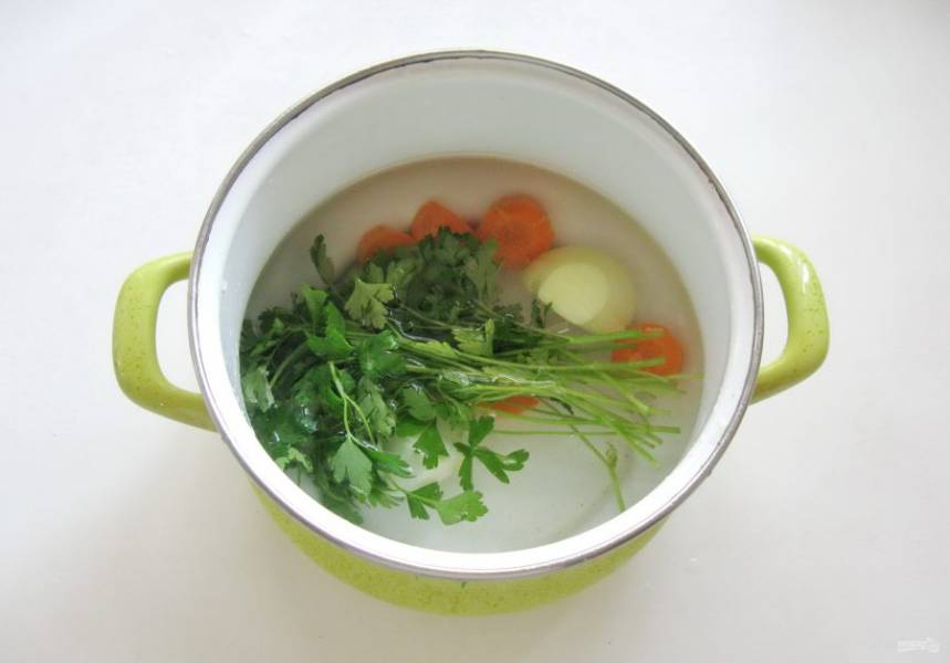 Залейте лук, морковь и петрушку водой. Поставьте кастрюлю на плиту и варите овощи с петрушкой 15 минут.
