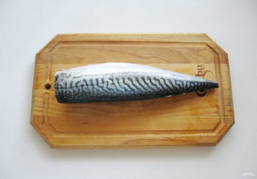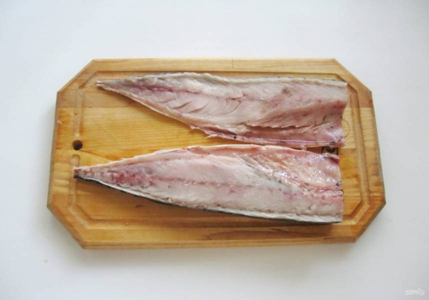 Разрежьте тушку вдоль на две части. Удалите хребет и косточки. Должно получится филе скумбрии.