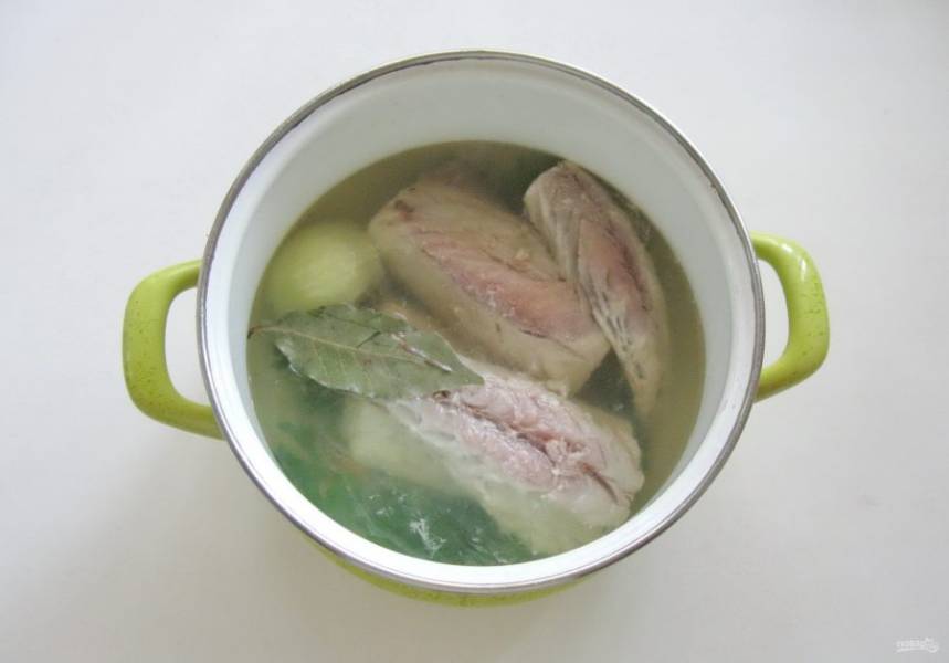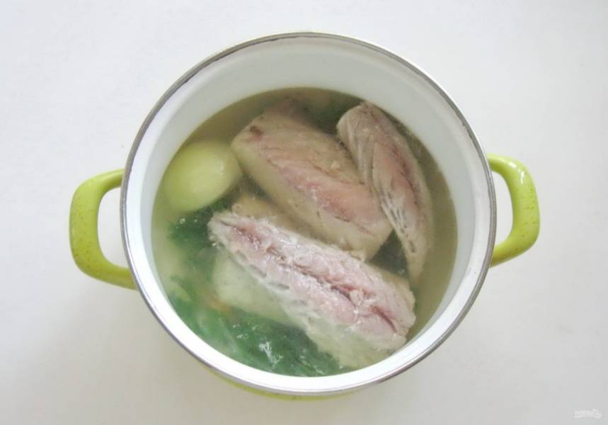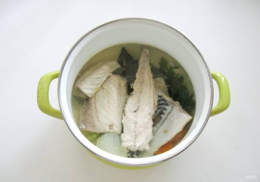 Доведите рыбу до кипения, снимите пену и варите на самом минимальном огне 20-25 минут.