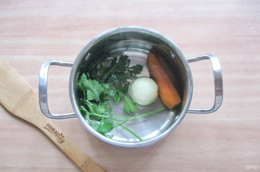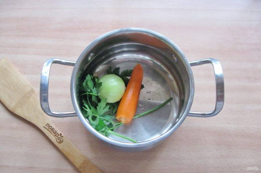 Морковь и лук очистите и помойте. Помойте петрушку. Выложите эти ингредиенты в кастрюлю.