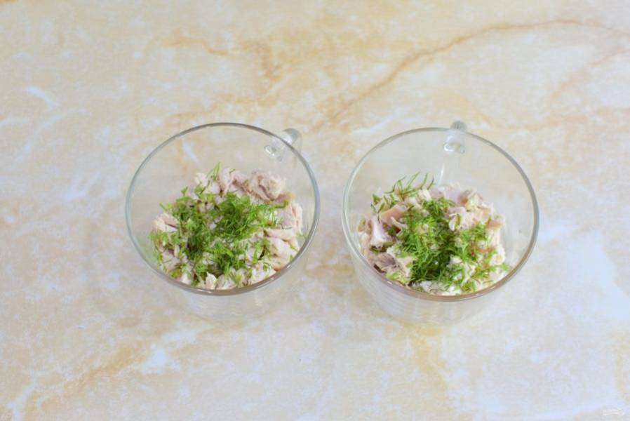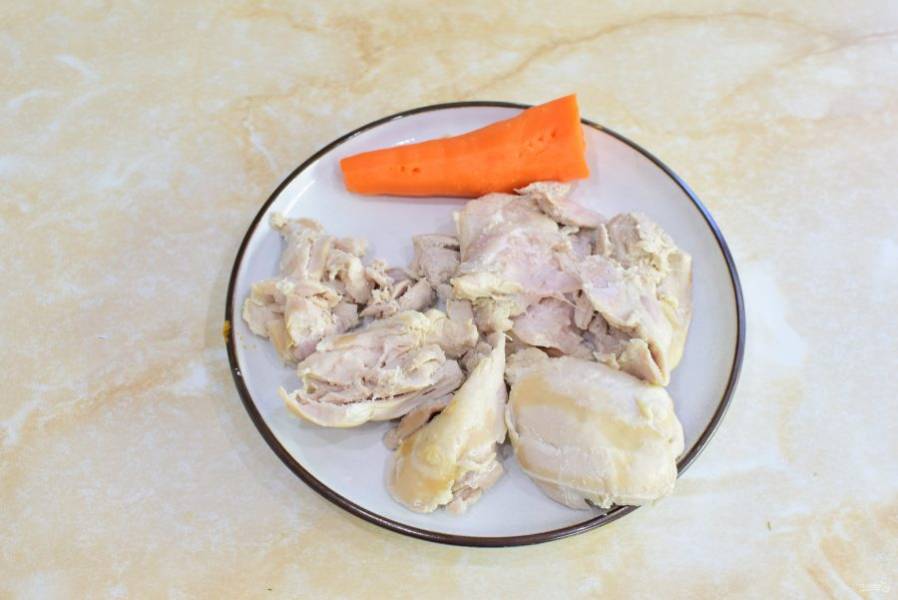 Куриное филе и морковь остудите до комфортной температуры и нарежьте на кусочки.