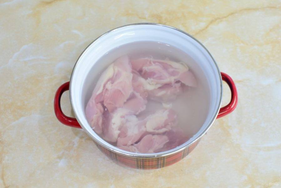 Куриное мясо залейте холодной водой, поставьте на огонь и доведите до кипения. При закипании будет появляться пенка. Её необходимо снимать.