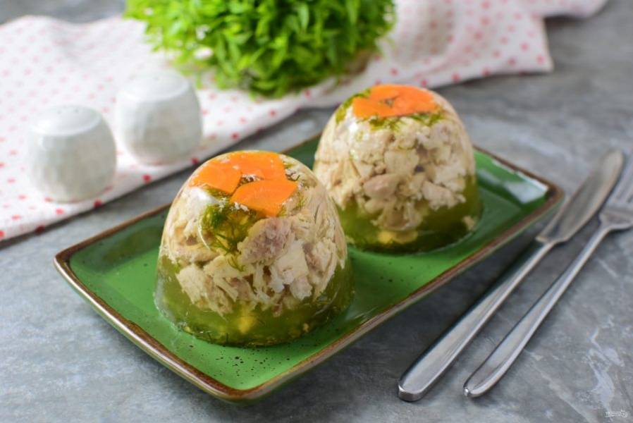Готовое заливное сбоку подцепите ножом и оно начнет выходить из формы. Выложите на тарелку и подавайте к столу. Приятного аппетита!