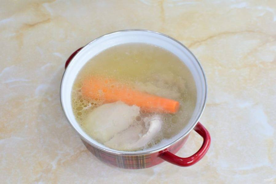 Куриное мясо проварите 10-15 минут. Затем добавьте к нему очищенную морковь. Подсыпьте соль и специи. Оставьте вариться на небольшом огне еще на 20-25 минут.