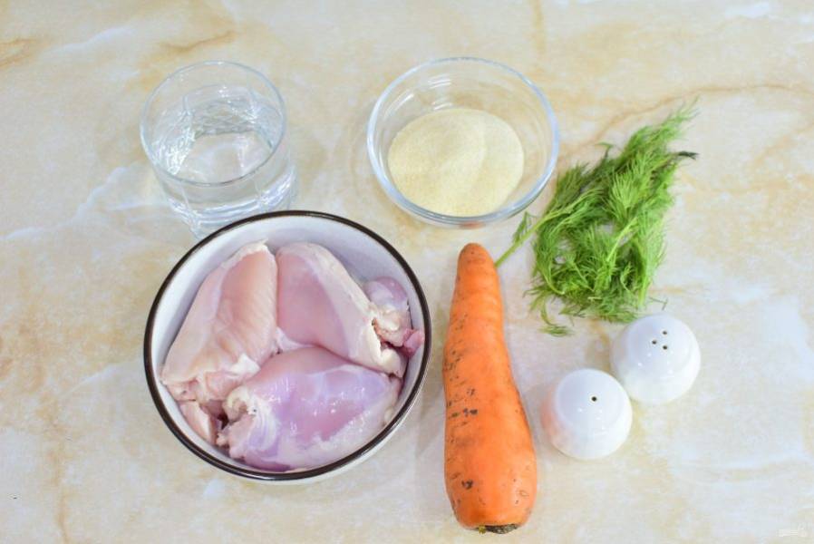 Для приготовления заливного подготовьте необходимые ингредиенты. Куриное мясо берите без костей. Это может быть куриная грудка или филе бедер.