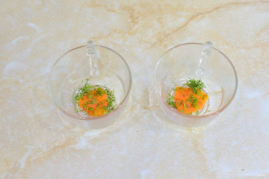 Затем из бульона выловите мясо и морковь. Соедините горячий бульон (750 мл.) и набухший желатин. Дайте желатину полностью раствориться. Затем процедите.