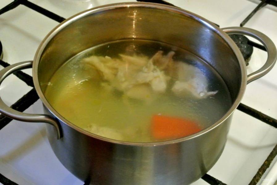 Курицу весом 1-1,2 кг промыть, разрезать на 4 части, выложить в кастрюлю, влить 1,2 литра воды, посолить. Выложить очищенные лук и морковь. Довести до кипения, снять пену, добавить перец горошком. Варить 1 час, периодически снимая пену.