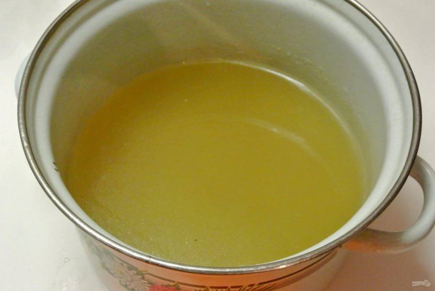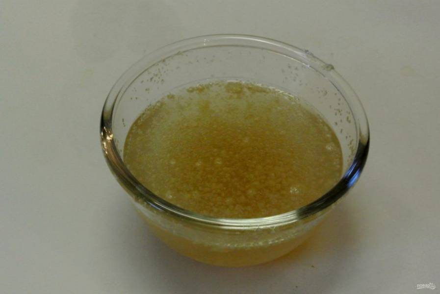 Бульон процедить. Отлить 1,5 стакана бульона, остудить. Всыпать желатин, оставить на 40 минут.