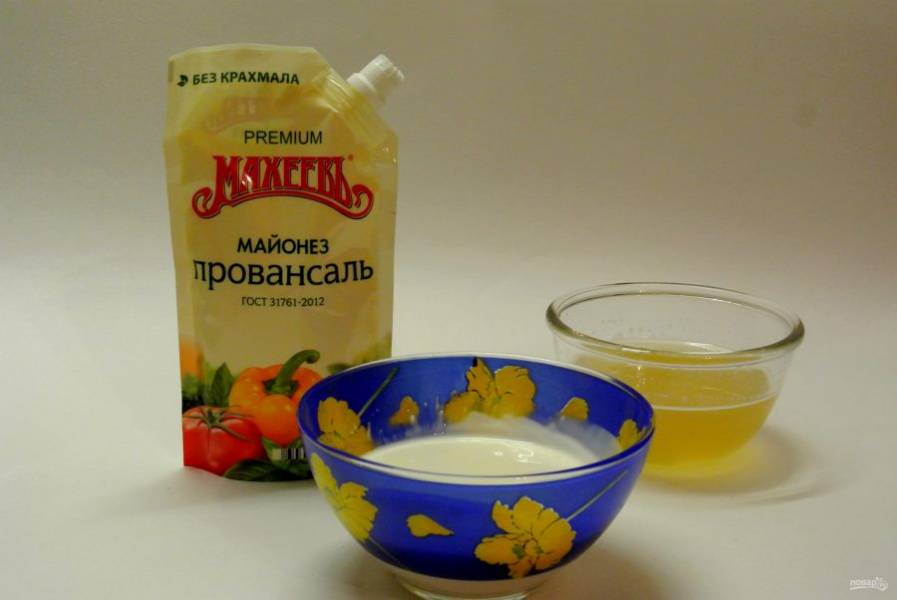 Замоченный желатин нагреть на водяной бане до растворения желатина. Слегка остудить. В майонез влить 6 столовых ложек распущенного желатина, перемешать.