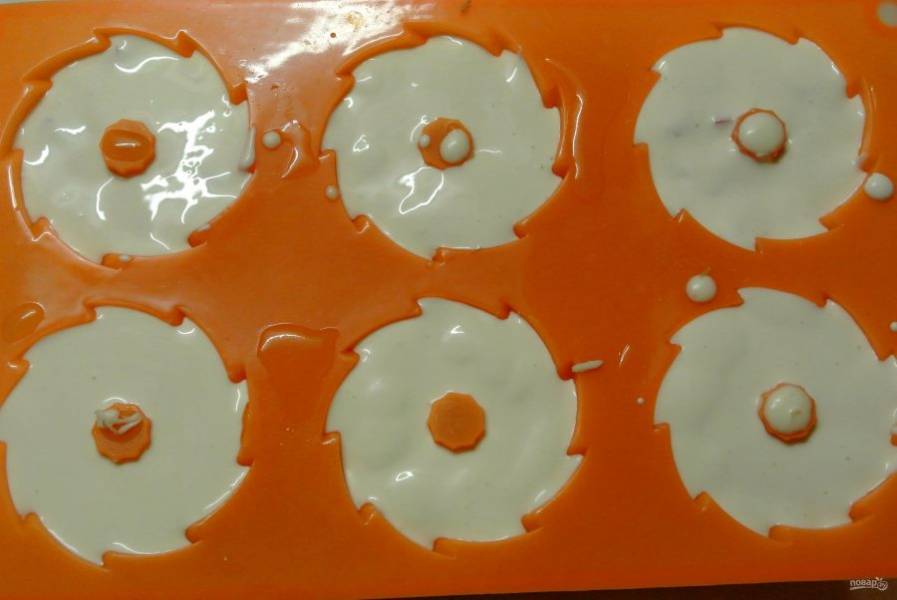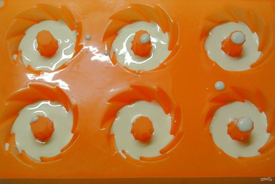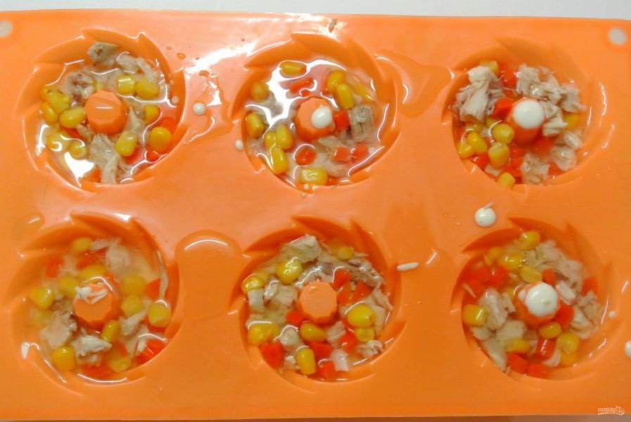 Приготовить силиконовые формочки, из них удобно доставать заливное. На дно формочек налить немного майонеза с желатином. Убрать в холодильник для застывания.