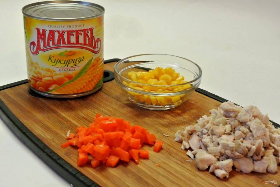 Вынуть курицу и овощи. Мясо курицы отделить от костей и кожицы, мелко нарезать кубиками. Морковь вынуть из бульона и нарезать кубиками. Лук не понадобится. Консервированную кукурузу Махеевъ отцедить от маринада.