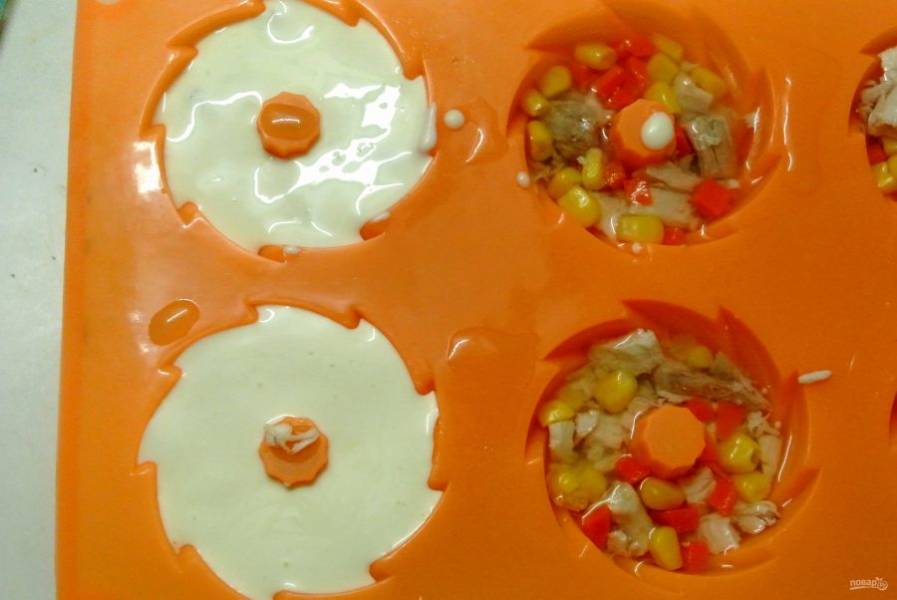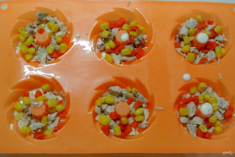 Достать формочки из холодильника, выложить кукурузу Махеевъ, кусочки курицы и нарезанную морковь.