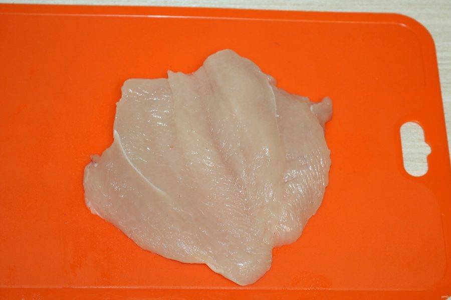 Куриную грудку разрежьте пополам, раскройте как книжку.