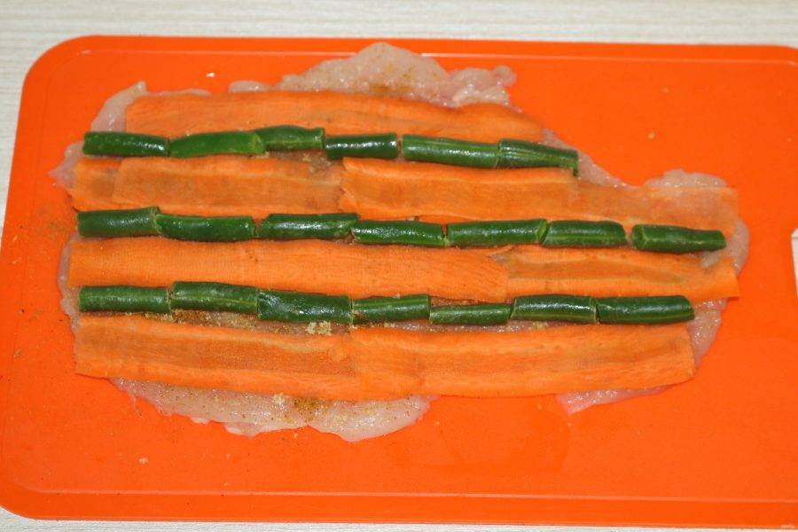 На куриную грудку выложите очищенную морковь, нарезанную слайсами. В промежутках уложите стручковую фасоль.