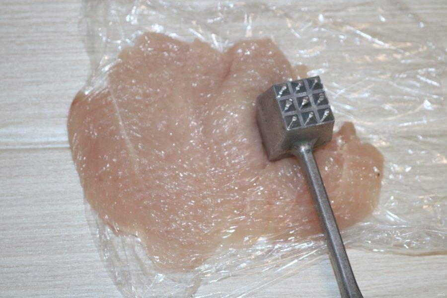 Разложите куриную грудку на пищевой плёнке, отбейте её с двух сторон.