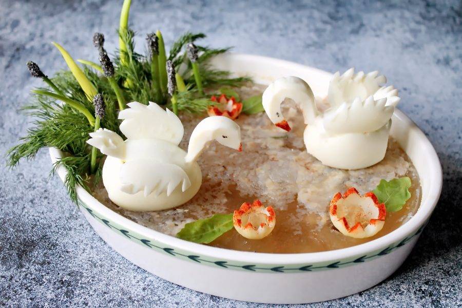Если на праздничный стол вы не хотите ставить обычный холодец, украсьте его в виде озера с белыми лебедями. Получается очень красиво и совершенно не сложно, если есть опыт варки холодца и карвинга.