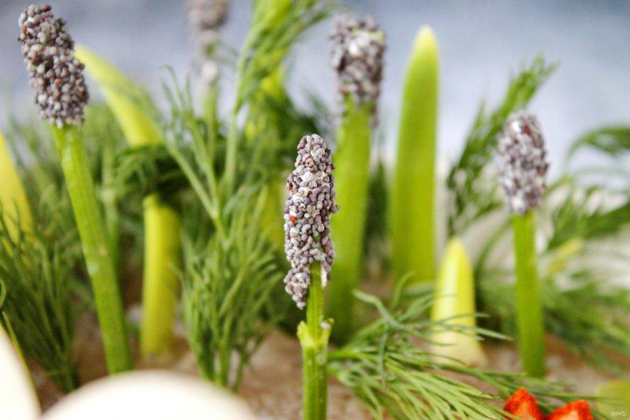 По одному краю сделайте заросли из перышек лука и веточек укропа. У петрушки удалите листья и на одну сторону налепите мягкий сыр. После этого покатайте эту сторону в маке, камыш готов. Установите камыши между зеленью.