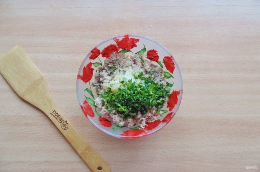 Репчатый лук нарежьте и обжарьте в сковороде с подсолнечным маслом. Петрушку мелко нарежьте. Добавьте лук и петрушку к курице.