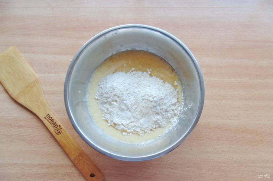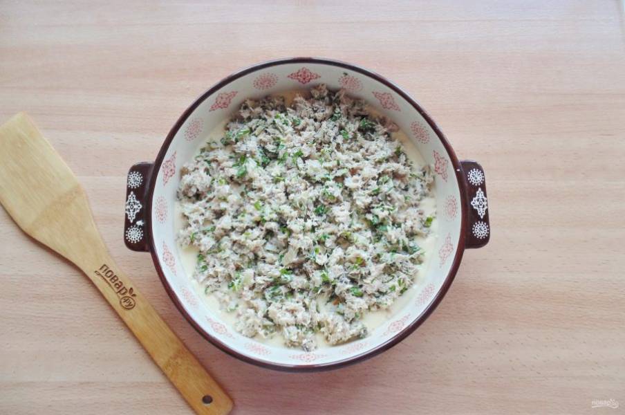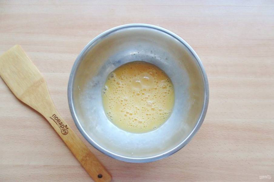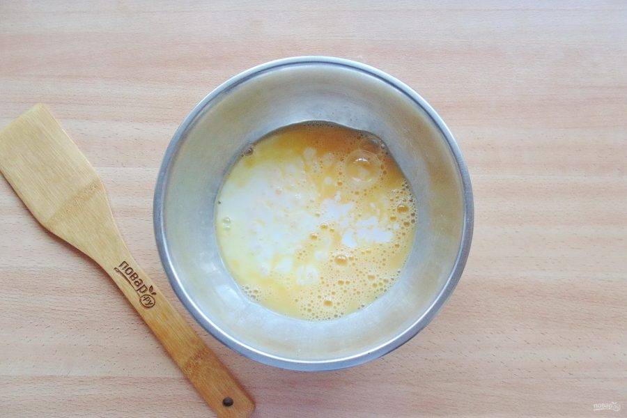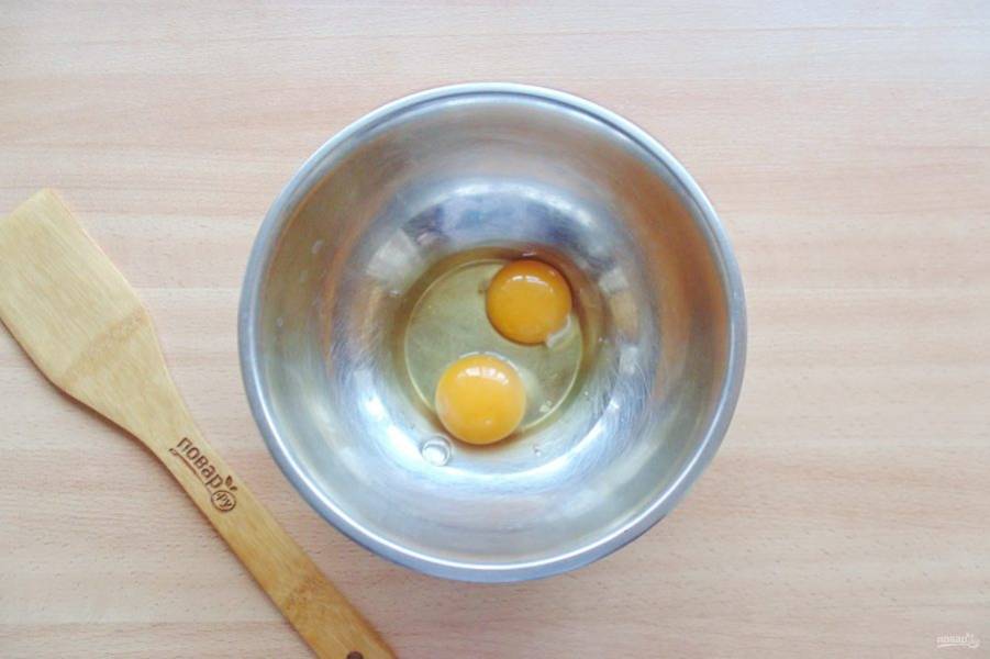 Приготовьте тесто для пирога. В миску разбейте яйца.